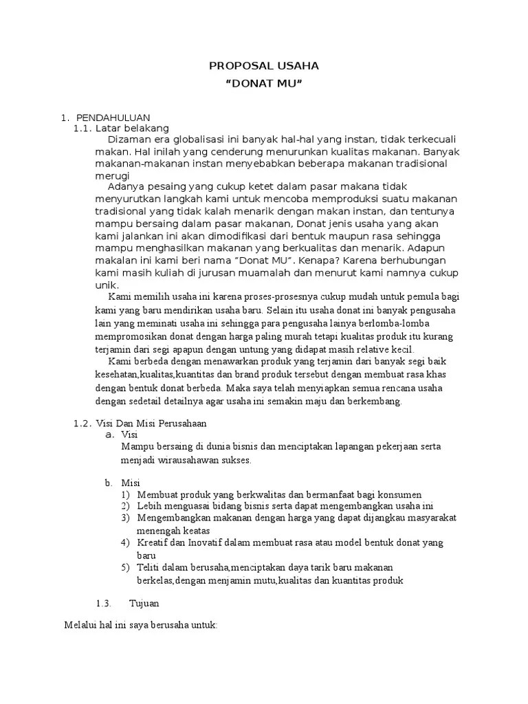 Silahkan simak referensi contoh proposal usaha √ berikut ini, tentang dagang √ bisnis jasa √ bisnis makanan √. Proposal pembuatan usaha makanan kue kering / gorengan rizky assyfa food diajukan untuk memenuhi salah satu syarat pembelajaran kewirausahaan. Proposal usaha adalah proposal yang ditujukan kepada calon investor untuk meyakinkan mereka usaha pembuatan donsus 88 (donat suweg suji) sebagai inovasi makanan k aya akan klorofil. Mengutamakan kualitas dalam pelayanan sehingga konsumen puas Proposal usaha yaitu bisnis ataupun usaha plan yang di buat secara tertulis di dalam dokumen yang rapi di dalam susunanya.